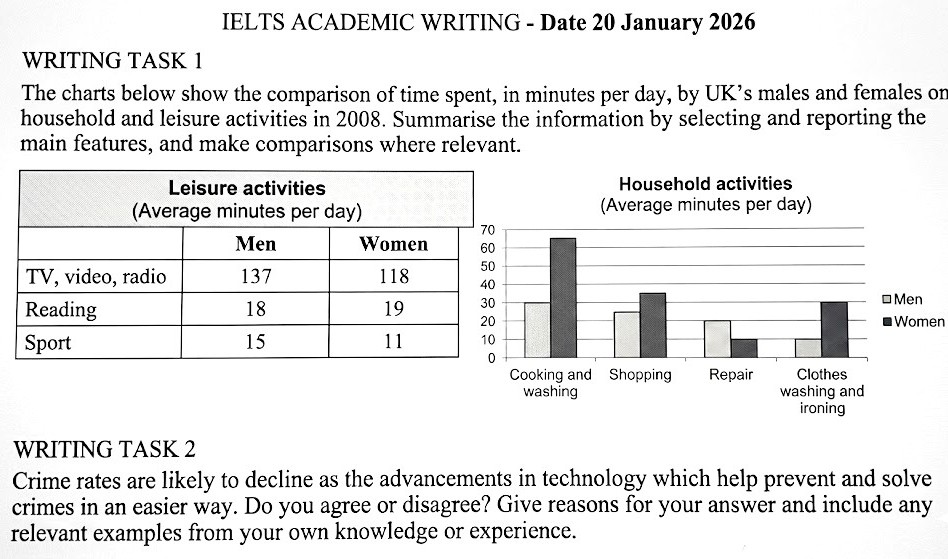 Đề bài: The charts below show the comparison of time spent, in minutes per day, by UK’s males and females on household and leisure activities in 2008.