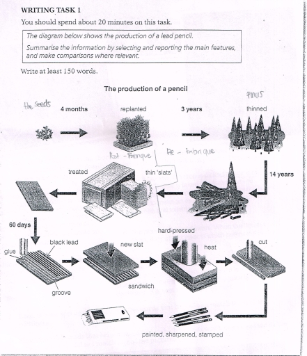 The diagram illustrates how lead pencils are produced, from tree cultivation to factory finishing.