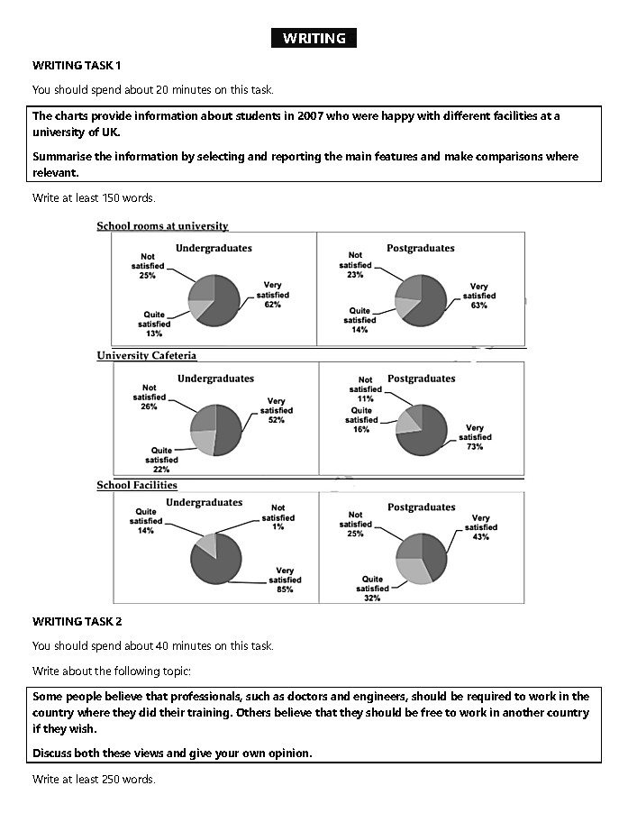 • The pie charts illustrate the proportions of undergraduate and postgraduate students at a UK university who expressed different levels of satisfaction with three facilities in 2007.